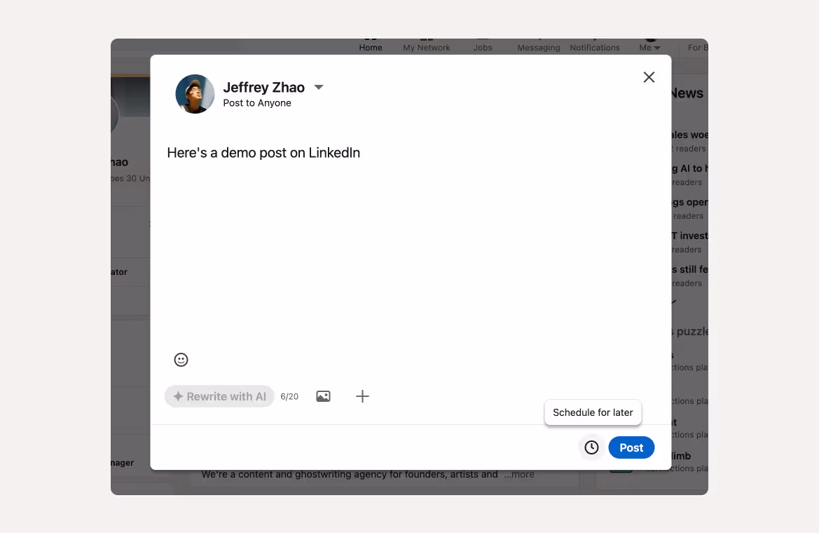 - Draft Your Content and Schedule: Write your post in our Notion-like editor and use the social preview to see how your post will look on LinkedIn. Select your desired date and time for publishing, and click "Schedule Post" to queue your post.