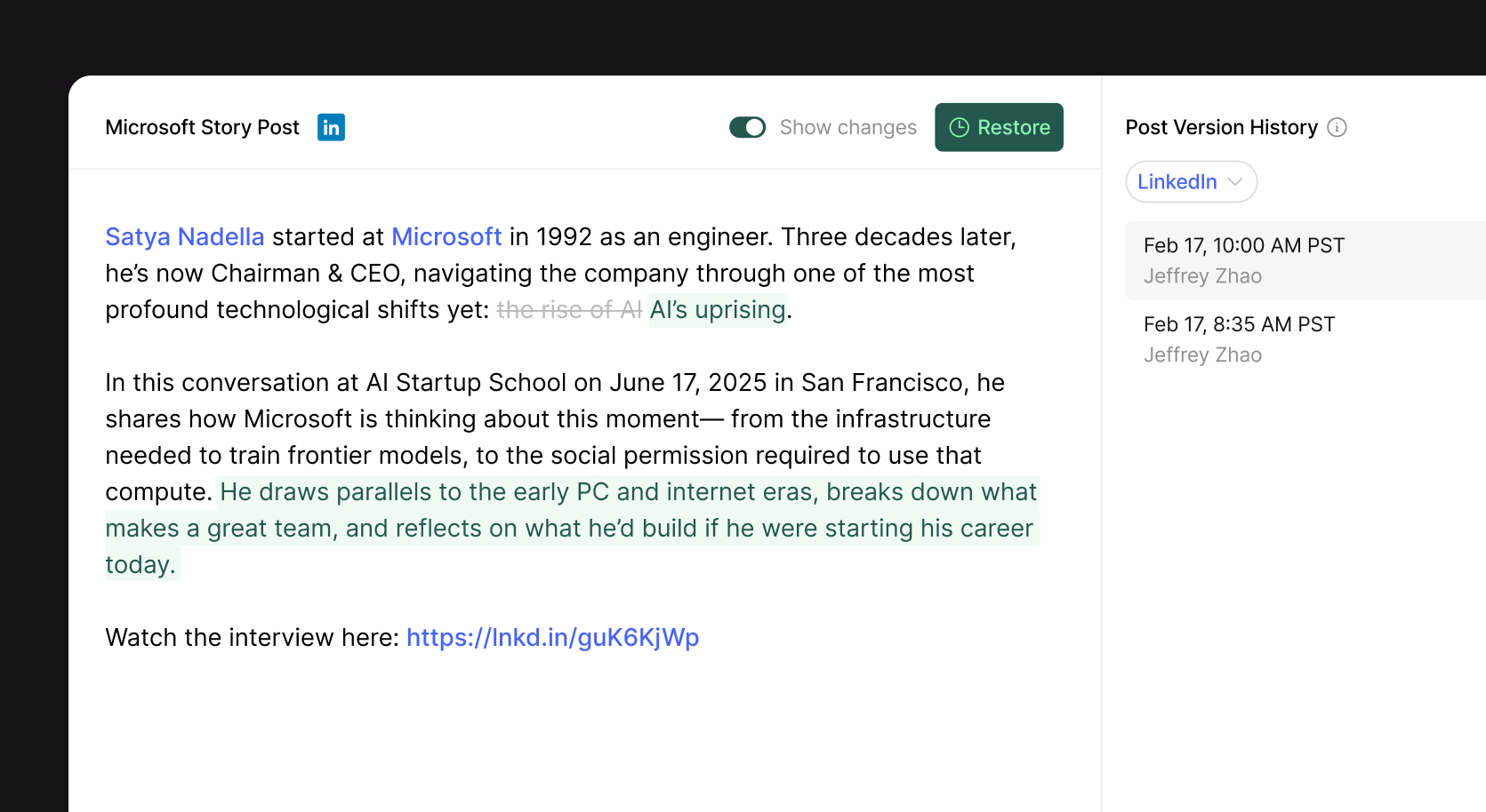 You can now view and restore previous versions of your post copy. Open any post and click the history icon in the header to browse every saved version, see who made changes and when, and preview exactly what the post looked like at that point.