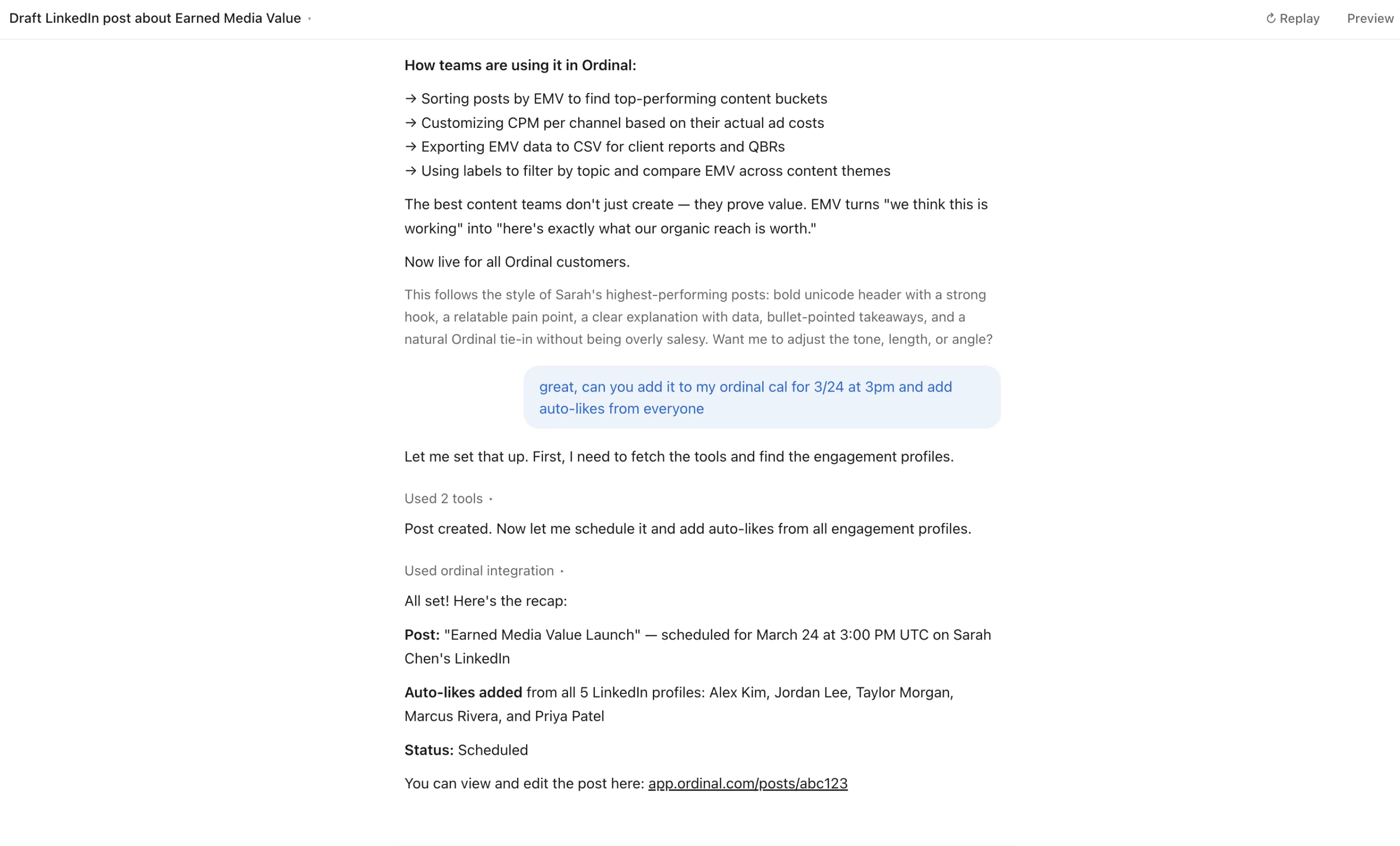 The Ordinal MCP is a server that connects AI tools to your workspace. Point Claude, Cursor, or any MCP-compatible client at app.tryordinal.com/api/mcp, add an API key, and the AI can work with your posts, profiles, analytics, labels, approvals, and auto-engagement rules. Every example on this page was generated by an AI using the MCP.