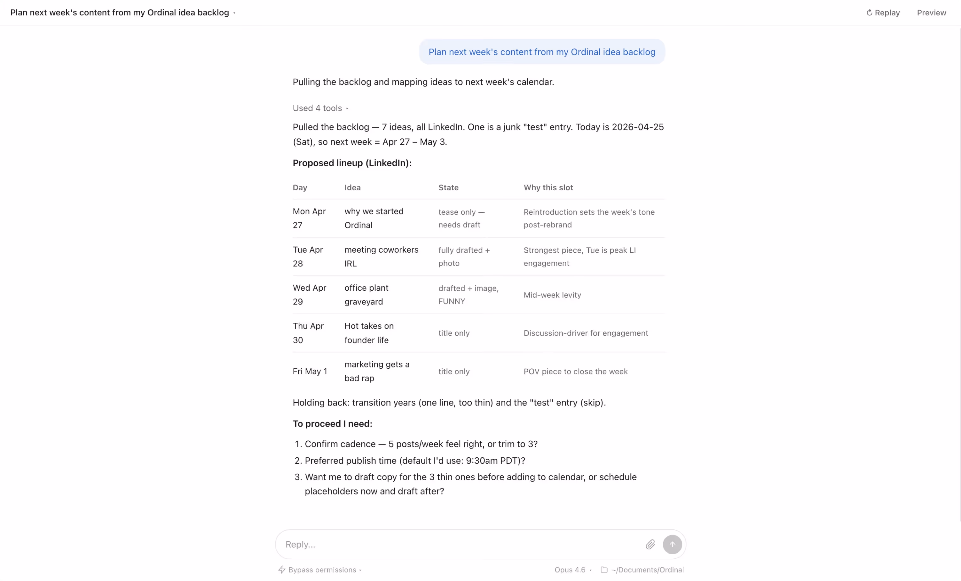 The AI pulls every idea sitting in your Ordinal idea backlog via the Ordinal MCP, reads each one’s draft state and notes, and assigns ideas to next week’s calendar based on day-of-week patterns, post readiness, and theme balance. It flags which ideas still need a draft and which are ready to schedule, and explains why each slot was chosen.