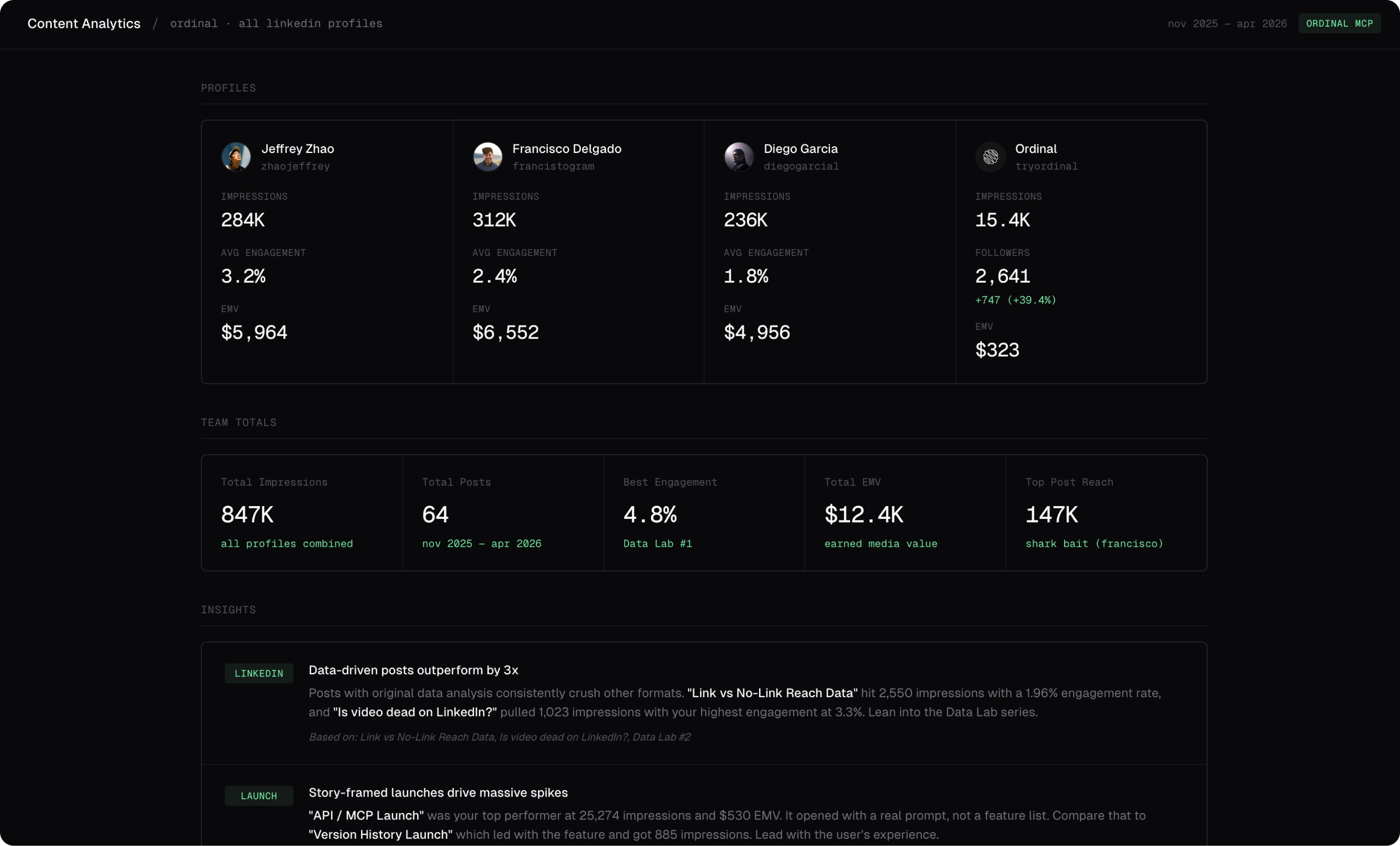 The Ordinal MCP is a server that connects AI tools to your workspace. Point Claude, Cursor, or any MCP-compatible client to Ordinal, and the AI can work with your posts, profiles, analytics, labels, approvals, and auto-engagement rules. Every example on this page was generated by an AI using the MCP.